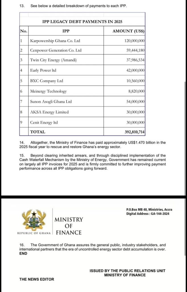 A significant portion was used to fully repay amounts drawn under the World Bank’s Partial Risk Guarantee, which had been depleted after government failed to meet payment obligations linked to gas supplied from the Offshore Cape Three Points (OCTP) project.