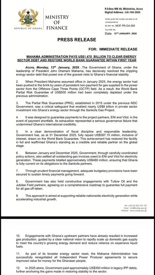 The Government of Ghana has announced a breakthrough in the energy sector after successfully clearing a US$1.47 billion debt and restoring a US$500 million World Bank Partial Risk Guarantee, marking a significant turnaround for the country’s power industry.